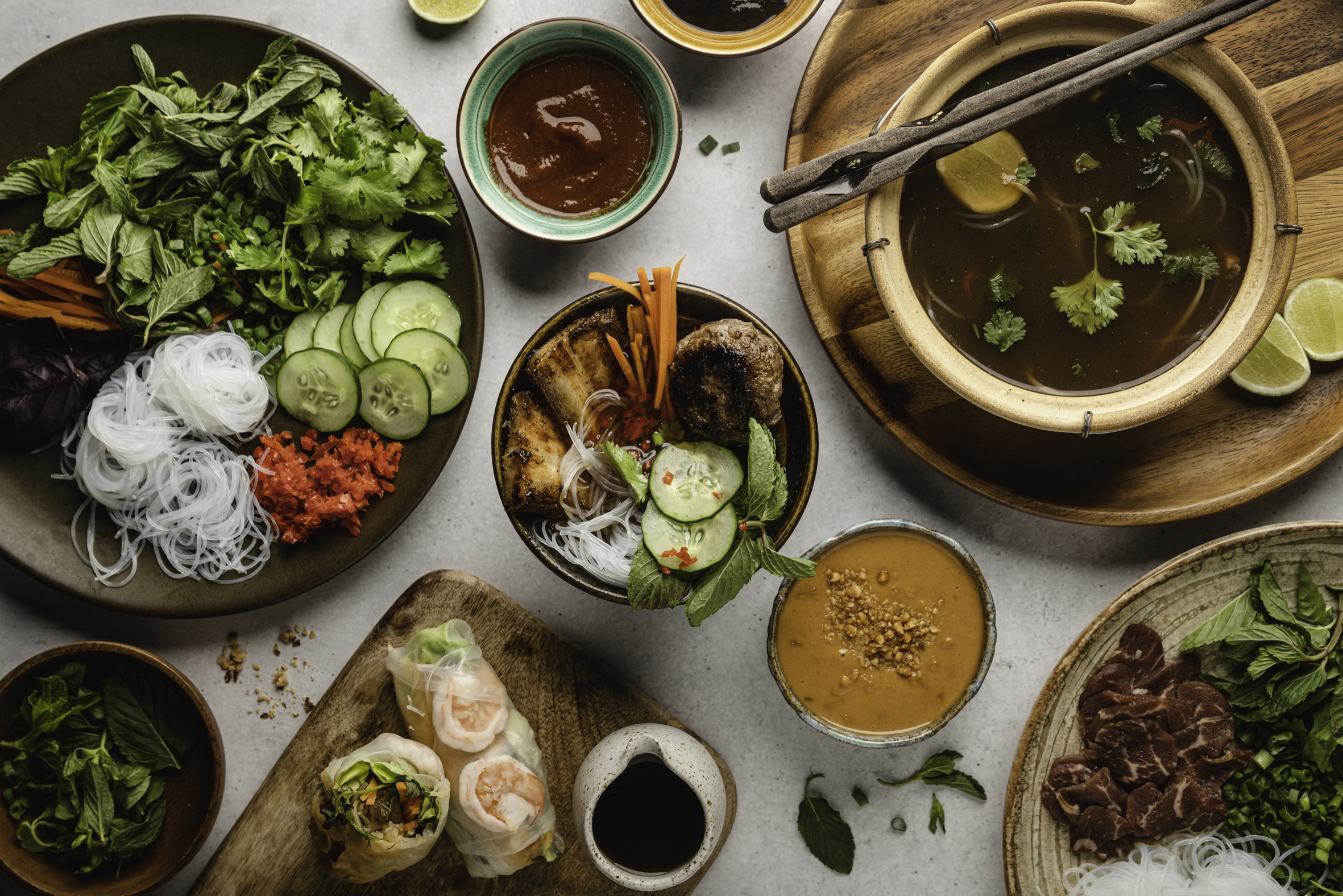 Pasamos luego a Vietnam, con un Pho bo (caldo de ternera especiado, fideos de arroz y verduras), un Bun cha con albóndigas marinadas y un clásico rollito vietnamita o rollo de verano.